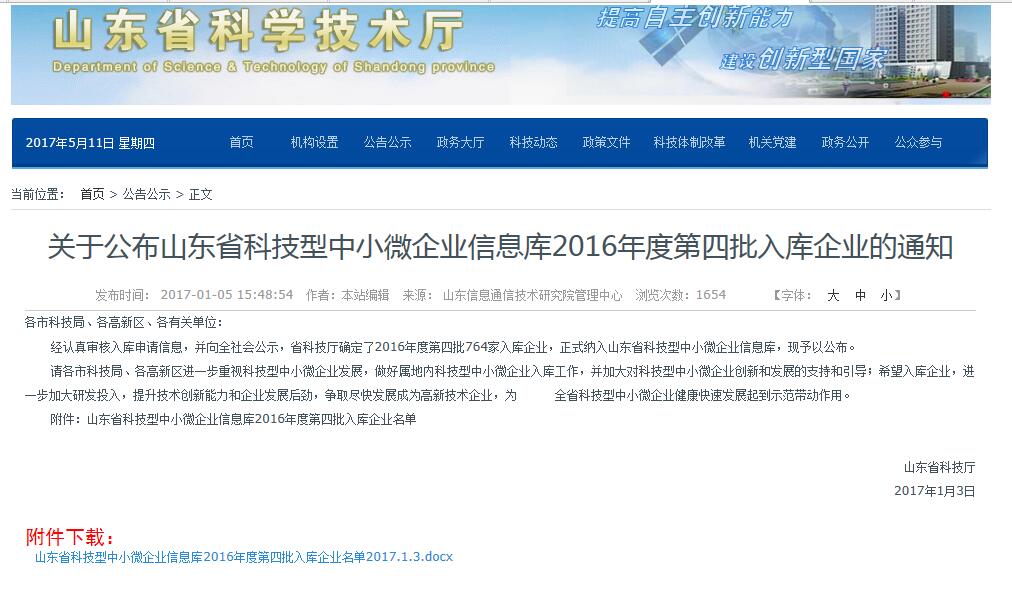 關于公布山東省科技型中小微企業(yè)信息庫2016年度第四批入庫企業(yè)的通知